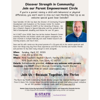 Special speaker who will join us via Zoom at our next Parent Empowerment Circle meeting. Our next meeting is: Sunday, April 27, 2025 from 1:30 to 3:30 PM at First Southern Baptist Church, 1818 S. Main Street, Fort Scott, KS.Please share with anyone who may be interested!Below is more information about our guest speaker, Sean Swindler:Sean Swindler, M.S.Ed. has been Director of Community Program Development and Evaluation at The Kansas Center for Autism Research and Training (K-CART) at the University of Kansas. Mr. Swindler has a Master’s Degree in Special Education and has worked in the field of developmental disability and Autism for over 30 years.