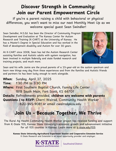 Mr. Swindler has been at K-CART since 2008. In his role at K-CART, Sean has led the Autism Resource Center, assisting families and adults Autistics with system navigation, has been involved in multiple federally and state funded research and training projects, is the self-advocate and special education faculty for the KUMC LEND (Leadership Education in Neurodevelopment and Related Disabilities), has been involved in state policy advocacy related to Autism and I/DD and has had the pleasure of helping to facilitate the Johnson County Community College Neurodiversity Club. Prior to coming to KU Swindler was coordinator for the Self-Advocate Coalition of Kansas, was a project manager at Social and Rehabilitation Services for the state of Kansas, and has worked as a direct support professional and I/DD Waiver Targeted Case Manager.Sean along with his wife, Jamie are the proud parents of a 23-year-old on the autism spectrum and learn new things every day from these experiences and from the families and Autistic friends and partners he has been lucky enough to work alongside.We look forward to hearing from Sean Swindler at our next Parent Empowerment Circle on Sunday, April 27, 2025 from 1:30 to 3:30 PM at First Southern Baptist Church, 1818 S. Main Street, Fort Scott, KS.